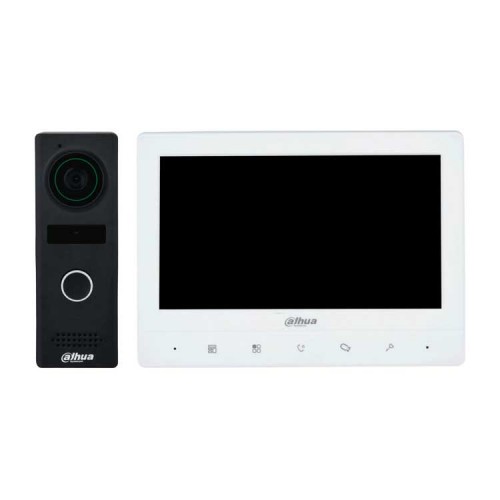 DHI-VTH1020J-T+DHI-VTO1000JM DHI-VTH1020J-T 7-дюймовый TFT-экран, сенсорный, 1024×600; 4-х проводная связь, функция видеодомофона: разблокировка, голосовой вызов, видеозвонок, регулировка громкости; Поддержка 2 вызывных панелей + 3 внутренних мониторов, несколько звуков звонка; поддержка цифрового широкого динамического диапазона (DWDR), DC12V/2A, 134х183х18 мм; DHI-VTO1000JM - Вызывная видеопанель, накладная, 4-х проводная, CMOS-матрица 1,3 МП, угол обзора 70°, IP66, -30...+60°C, 132х46х34 мм