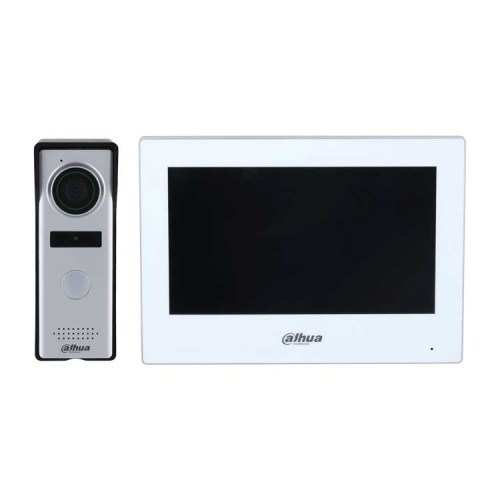 Комплект видеодомофона:DHI-VTO1000J: Вызывная панель, 4-х проводная, с разрешением камеры 1.3мп и CMOS сенсором, Камера 1.3 Мп, углы обзора (Г/В): 70/40, DWDR; пластиковый корпус; -30...+60°C, 132х46х34 мм; DC 12В. DHI-VTH2624GW-WP:Монитор видеодомофона, сенсорный, WiFi, 7" TFT 4-проводный, разрешение 1024х600, DC 12В, 1 A, PoE, -10...+55°C, 190х135х26 мм.