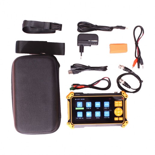 TSH-H-5 Универсальный 5-дюймовый монитор-тестер AHD/CVI/TVI/CVBS-видеосистем. Разрешение экрана -800x480. Поддерживаемые стандарты: 8Mp TVI, 8Mp CVI, 8Mp AHD, RS485 PTZ, HDMI 4K, VGA. Разъемы: BNC, клеммы(RS485), RJ45, jack 3,5мм вход, VGA вход, HDMI вход, разъем DC (12V/1A) выход, USB выход, USB micro (5V) вход. Батарея Li-ion 3,7V 5200mAh; Размеры (ШxBxГ): 184x110х41мм; Рабочая температура от -10°С до 50°С.